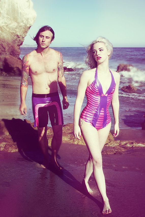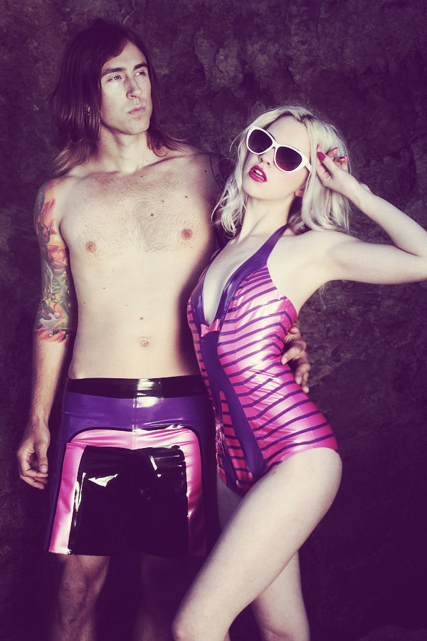 It’s been hot, really hot, this summer. To provide some relief from the scorching sun and humidity, we are showing off some of the coolest vinyl and latex fashions we’ve found for summer. First off is one of our favorite designers, Abigail Greydanus, who created awesome fashions for both men and women from latex sheeting.
