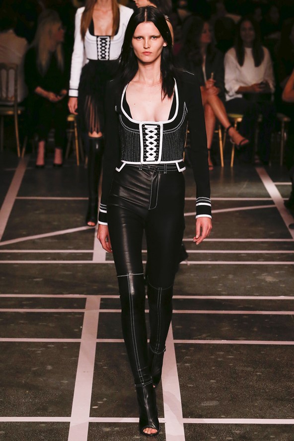 This season is all about contrast, and Givenchy did it best by pairing biker-chic leggings with more feminine pieces. Bold, paneled leggings were prominent throughout the show, featuring lace detailing or “dare to bare it all” nude skin for the more risqué.