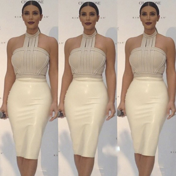 In one case, Kim keeps things subtle with a black pencil skirt and simple high necked top. Another look exuded a sense of Old Hollywood glamour, featuring Kardashian with a beige latex pencil skirt and classy but cool cut-out detailing at the neck. As winner of GQ’s Women of the Year 2014 award, Kim shined with a barely there corset, covered by a blinged out, bedazzled floor length gown. In one of her most recent looks from December 2014, Kim rocked a light beige Atsuko Kudo dress.
