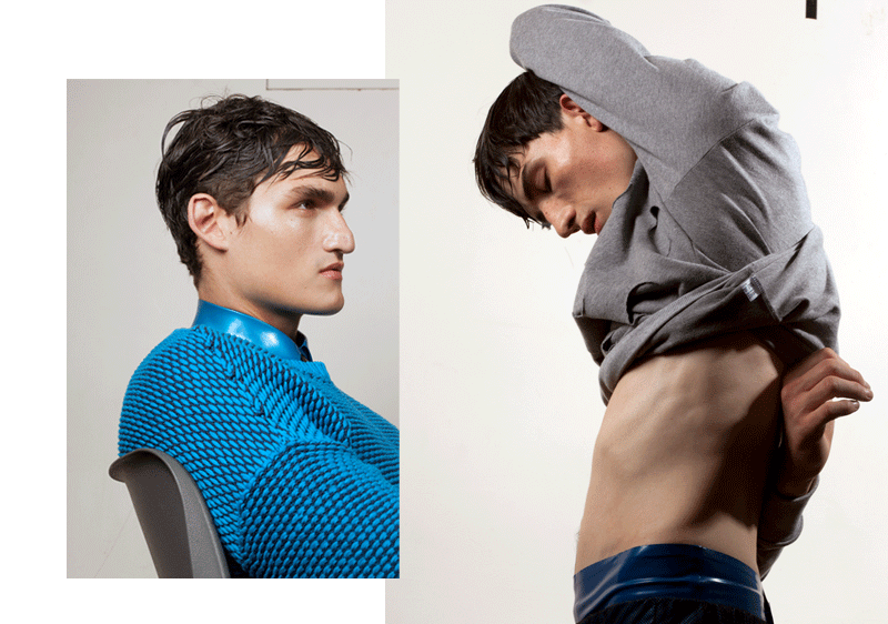 Originally featured in Grit Magazine for the “Pocky Game” issue from Spring 2013, the “Jester & Pablo” editorial stars male models, Jester White and Pablo Otero, in latex activewear.Photographed by Niclas Heikkinen, sportswear has been on the rise lately, with a plethora of designers sending athletic-inspired outfits down the runway season after season. According to the NPD Group, a company who tracks market research trends, found that the increase in apparel, footwear and accessories sales in 2014 as compared to 2013 was “driven primarily by growth in sales of activewear, athletic performance footwear and bags.”